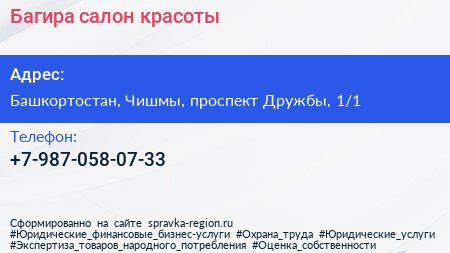 Багира, салон красоты по адресу Башкортостан, Чишмы, проспект Дружбы, 1/1 в дальнейшем Организация, размещена в следующих категориях: