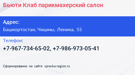 Бьюти Клаб, парикмахерский салон по адресу Башкортостан, Чишмы, Ленина, 55 в дальнейшем Организация, размещена в следующих категориях: