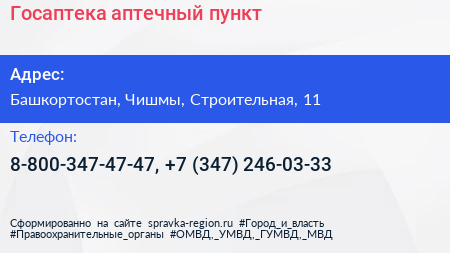 Госаптека, аптечный пункт по адресу Башкортостан, Чишмы, Строительная, 11 в дальнейшем Организация, размещена в следующих категориях:
