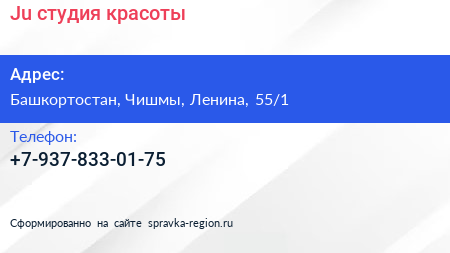 Ju, студия красоты по адресу Башкортостан, Чишмы, Ленина, 55/1 в дальнейшем Организация, размещена в следующих категориях: