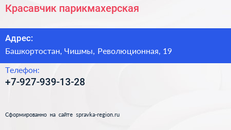 Красавчик, парикмахерская по адресу Башкортостан, Чишмы, Революционная, 19 в дальнейшем Организация, размещена в следующих категориях: