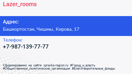 Lazer_rooms по адресу Башкортостан, Чишмы, Кирова, 17 в дальнейшем Организация, размещена в следующих категориях: