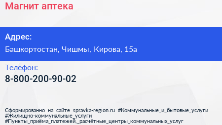 Магнит, аптека по адресу Башкортостан, Чишмы, Кирова, 15а в дальнейшем Организация, размещена в следующих категориях: