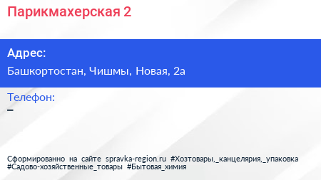 Парикмахерская №2 по адресу Башкортостан, Чишмы, Новая, 2а в дальнейшем Организация, размещена в следующих категориях: