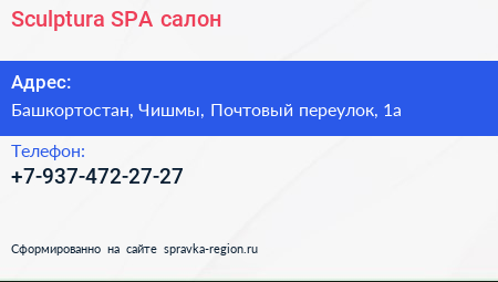 Sculptura, SPA-салон по адресу Башкортостан, Чишмы, Почтовый переулок, 1а в дальнейшем Организация, размещена в следующих категориях: