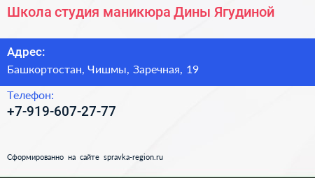 Школа-студия маникюра Дины Ягудиной по адресу Башкортостан, Чишмы, Заречная, 19 в дальнейшем Организация, размещена в следующих категориях: