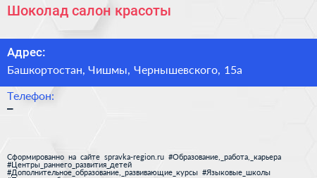 Шоколад, салон красоты по адресу Башкортостан, Чишмы, Чернышевского, 15а в дальнейшем Организация, размещена в следующих категориях:
