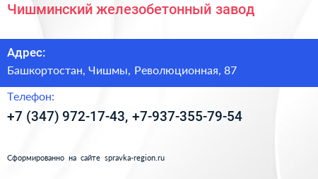 Чишминский железобетонный завод по адресу Башкортостан, Чишмы, Революционная, 87 в дальнейшем Организация, размещена в следующих категориях:
