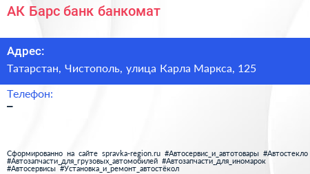 АК Барс банк, банкомат по адресу Татарстан, Чистополь, улица Карла Маркса, 125 в дальнейшем Организация, размещена в следующих категориях: