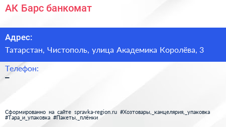 АК Барс, банкомат по адресу Татарстан, Чистополь, улица Академика Королёва, 3 в дальнейшем Организация, размещена в следующих категориях: