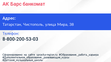 АК Барс, банкомат по адресу Татарстан, Чистополь, улица Мира, 38 в дальнейшем Организация, размещена в следующих категориях: