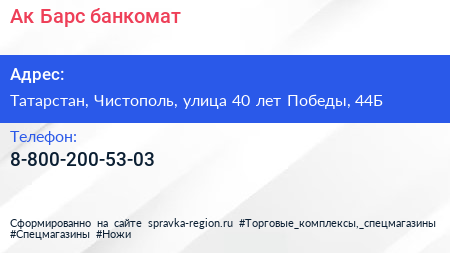 Ак Барс, банкомат по адресу Татарстан, Чистополь, улица 40 лет Победы, 44Б в дальнейшем Организация, размещена в следующих категориях: