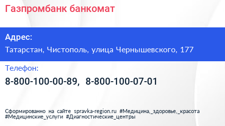 Газпромбанк, банкомат по адресу Татарстан, Чистополь, улица Чернышевского, 177 в дальнейшем Организация, размещена в следующих категориях: