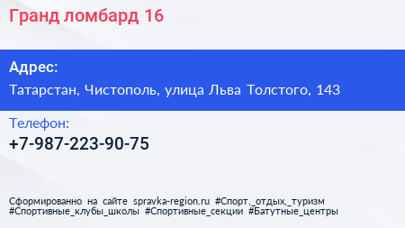 Гранд ломбард 16 по адресу Татарстан, Чистополь, улица Льва Толстого, 143 в дальнейшем Организация, размещена в следующих категориях: