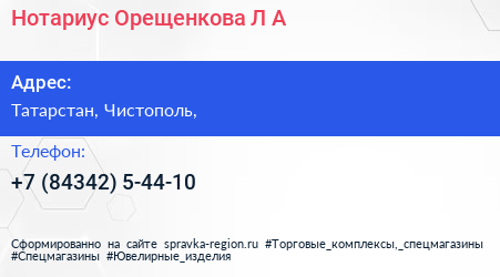 Нотариус Орещенкова Л.А. по адресу Татарстан, Чистополь, в дальнейшем Организация, размещена в следующих категориях: