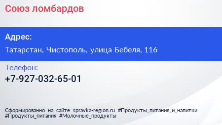 Союз ломбардов по адресу Татарстан, Чистополь, улица Бебеля, 116 в дальнейшем Организация, размещена в следующих категориях: