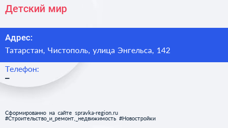 Детский мир по адресу Татарстан, Чистополь, улица Энгельса, 142 в дальнейшем Организация, размещена в следующих категориях: