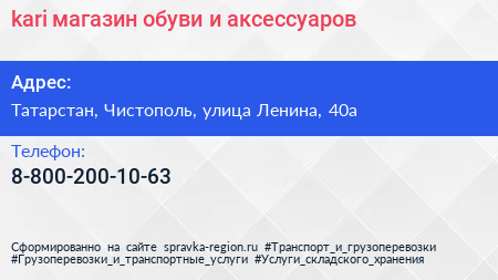 kari, магазин обуви и аксессуаров по адресу Татарстан, Чистополь, улица Ленина, 40а в дальнейшем Организация, размещена в следующих категориях: