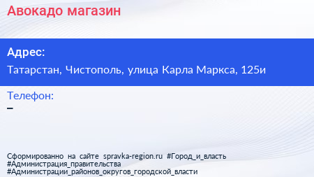 Авокадо, магазин по адресу Татарстан, Чистополь, улица Карла Маркса, 125и в дальнейшем Организация, размещена в следующих категориях: