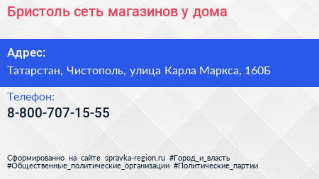Бристоль, сеть магазинов у дома по адресу Татарстан, Чистополь, улица Карла Маркса, 160Б в дальнейшем Организация, размещена в следующих категориях: