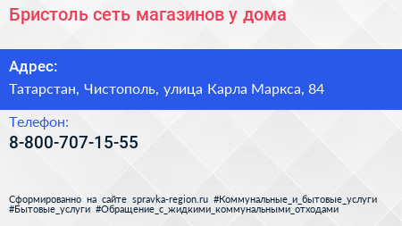 Бристоль, сеть магазинов у дома по адресу Татарстан, Чистополь, улица Карла Маркса, 84 в дальнейшем Организация, размещена в следующих категориях: