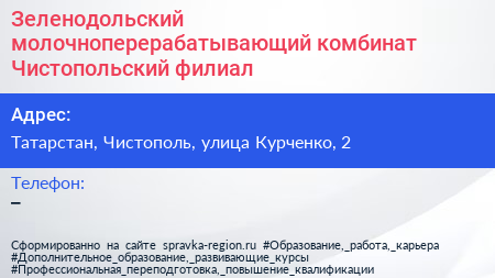 Зеленодольский молочноперерабатывающий комбинат, Чистопольский филиал по адресу Татарстан, Чистополь, улица Курченко, 2 в дальнейшем Организация, размещена в следующих категориях: