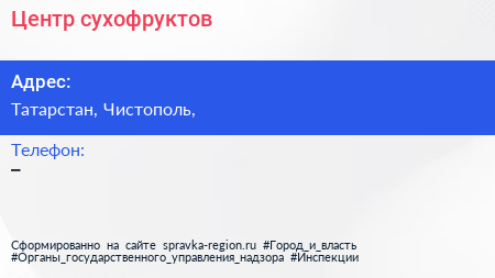 Центр сухофруктов по адресу Татарстан, Чистополь, в дальнейшем Организация, размещена в следующих категориях:
