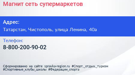 Магнит, сеть супермаркетов по адресу Татарстан, Чистополь, улица Ленина, 40а в дальнейшем Организация, размещена в следующих категориях: