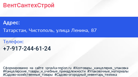 ВентСантехСтрой по адресу Татарстан, Чистополь, улица Ленина, 87 в дальнейшем Организация, размещена в следующих категориях: