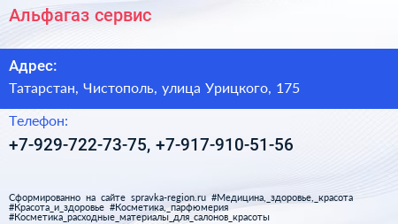 Альфагаз сервис по адресу Татарстан, Чистополь, улица Урицкого, 175 в дальнейшем Организация, размещена в следующих категориях: