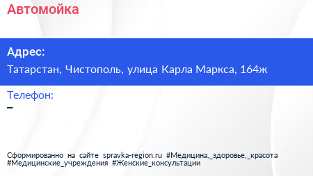 Автомойка по адресу Татарстан, Чистополь, улица Карла Маркса, 164ж в дальнейшем Организация, размещена в следующих категориях: