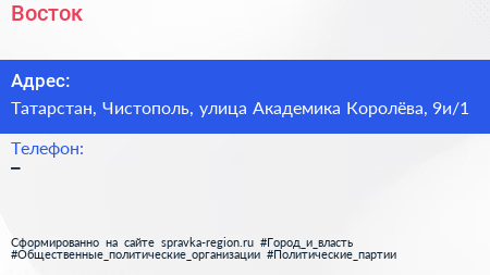 Восток по адресу Татарстан, Чистополь, улица Академика Королёва, 9и/1 в дальнейшем Организация, размещена в следующих категориях: