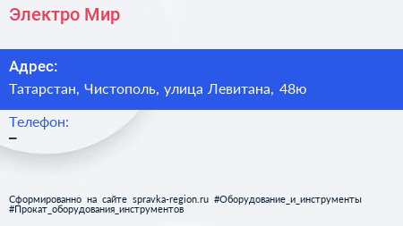 Электро Мир по адресу Татарстан, Чистополь, улица Левитана, 48ю в дальнейшем Организация, размещена в следующих категориях: