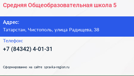 Средняя Общеобразовательная школа № 5 по адресу Татарстан, Чистополь, улица Радищева, 38 в дальнейшем Организация, размещена в следующих категориях: