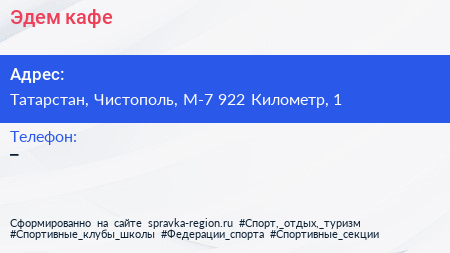 Эдем, кафе по адресу Татарстан, Чистополь, М-7 922 Километр, 1 в дальнейшем Организация, размещена в следующих категориях: