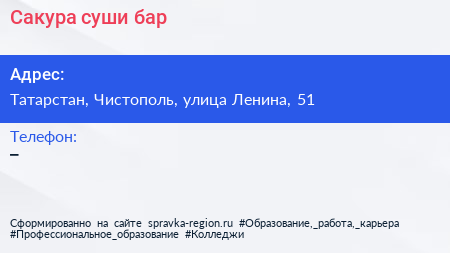 Сакура, суши-бар по адресу Татарстан, Чистополь, улица Ленина, 51 в дальнейшем Организация, размещена в следующих категориях: