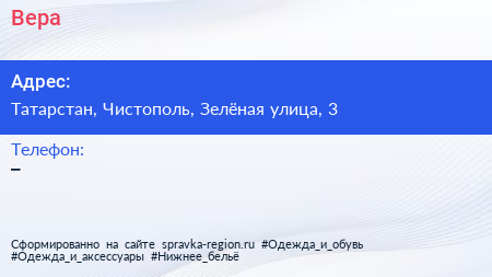 Вера по адресу Татарстан, Чистополь, Зелёная улица, 3 в дальнейшем Организация, размещена в следующих категориях: