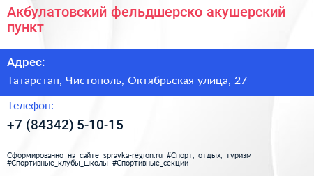 Акбулатовский фельдшерско-акушерский пункт по адресу Татарстан, Чистополь, Октябрьская улица, 27 в дальнейшем Организация, размещена в следующих категориях: