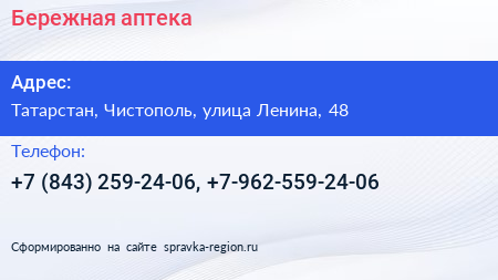 Бережная аптека по адресу Татарстан, Чистополь, улица Ленина, 48 в дальнейшем Организация, размещена в следующих категориях: