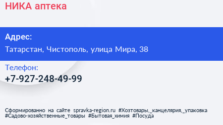 НИКА, аптека по адресу Татарстан, Чистополь, улица Мира, 38 в дальнейшем Организация, размещена в следующих категориях: