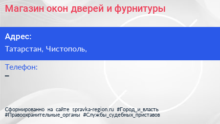 Магазин окон, дверей и фурнитуры по адресу Татарстан, Чистополь, в дальнейшем Организация, размещена в следующих категориях: