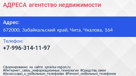 АДРЕСА, агентство недвижимости по адресу 672000, Забайкальский край, Чита, Чкалова, 164 в дальнейшем Организация, размещена в следующих категориях: