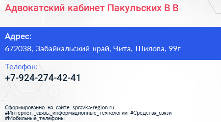 Адвокатский кабинет Пакульских В.В. по адресу 672038, Забайкальский край, Чита, Шилова, 99г в дальнейшем Организация, размещена в следующих категориях: