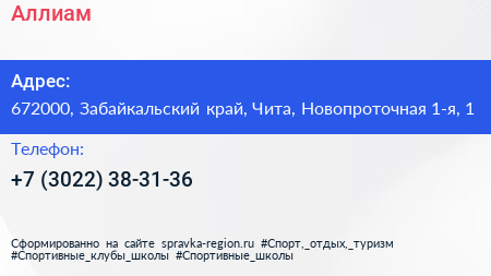 Аллиам по адресу 672000, Забайкальский край, Чита, Новопроточная 1-я, 1 в дальнейшем Организация, размещена в следующих категориях: