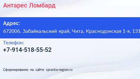 Антарес, Ломбард по адресу 672006, Забайкальский край, Чита, Краснодонская 1-я, 131 в дальнейшем Организация, размещена в следующих категориях: