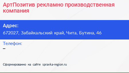 АртПозитив, рекламно-производственная компания по адресу 672027, Забайкальский край, Чита, Бутина, 46 в дальнейшем Организация, размещена в следующих категориях: