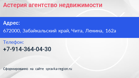 Астерия, агентство недвижимости по адресу 672000, Забайкальский край, Чита, Ленина, 162а в дальнейшем Организация, размещена в следующих категориях: