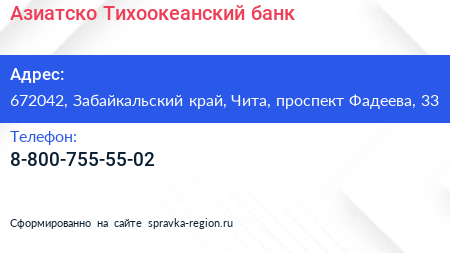 Азиатско-Тихоокеанский банк по адресу 672042, Забайкальский край, Чита, проспект Фадеева, 33 в дальнейшем Организация, размещена в следующих категориях: