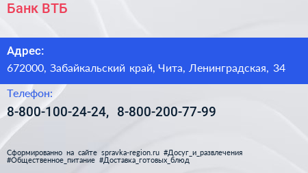Банк ВТБ по адресу 672000, Забайкальский край, Чита, Ленинградская, 34 в дальнейшем Организация, размещена в следующих категориях: