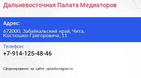 Дальневосточная Палата Медиаторов по адресу 672000, Забайкальский край, Чита, Костюшко-Григоровича, 11 в дальнейшем Организация, размещена в следующих категориях:
